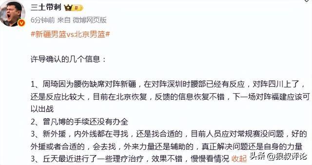 许利民表示:周琦因为腰伤缺席对阵新疆,在对阵深圳时腰部已经有反应,对阵四川上了,还是反应比较大,目前在北京恢复,反馈的信息恢复不错,下一场对阵福建应该可以出战。