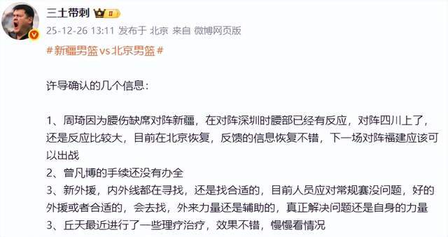 根据著名媒体人三土带刺老师在中午13点给出的消息来看,许利民指导一共确认了4个消息,第一条就是关于周琦的。三土带刺老师是这样说的:“周琦因为腰伤缺席对阵新疆,在对阵深圳时腰部已经有反应,对阵四川上了,还是反应比较大,目前在北京恢复,反馈的信息恢复不错,下一场对阵福建应该可以出战。”