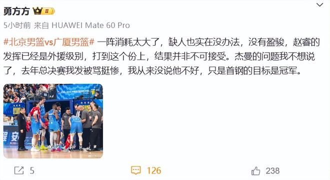 北京记者勇方方直接点名杰曼:一阵消耗太大了,缺人也实在没办法,没有盈骏,赵睿的发挥已经是外援级别,杰曼的问题我不想说了,去年总决赛我发被骂挺惨,我从来没说他不好,只是首钢的目标是冠军。