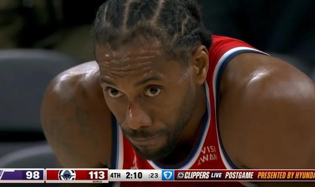 然后伦纳德就暴走了,连续命中三分,连续助攻队友命中三分,单节狂砍20分,全场拿下45分,这已经是他拿到55分之前的生涯最高分。最后时刻的一个镜头,伦纳德脸上都出血了,表情仍是面沉似水,活脱脱一个冷血“杀手”。