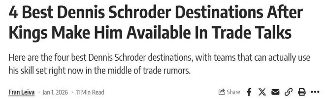 身背3年4500万美元合同,国王队正式甩卖施罗德!美媒《FW》晒出其4大下家候选,其中重回勇士队携手库里争冠高居第二名。