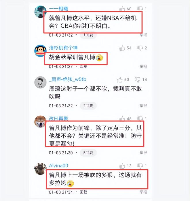 虽然范子铭、翟晓川、方硕不得到教练重用,打的时间只是几分钟,数据也不起眼。但是赛后北京球迷并不喷这三名球员,倒是喷起曾凡博,认为他是最失望之人。曾凡博不但进攻端无所作为,防守端也是被胡金秋打爆,完全限制不了胡金秋。球迷失望地说,“这个被球迷和媒体吹爆的曾凡博绝不可大用,基础差,技术差”、“曾凡博作为前锋,除了定点三分,其他都不会,关键还不是经常准!防守更是漏勺!”、“就曾凡博这水平,还嫌NBA不给机会?CBA你都打不明白。”球迷说得没有错,曾凡博真的除了定点三分外,其他的都不会。你们说呢?