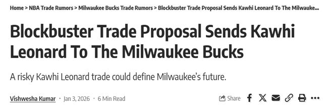 洛杉矶快船凭借一波酣畅淋漓的6连胜似乎让球迷看到附加赛的曙光,伦纳德6连胜期间场均39分,宣告战神回归,但是就在今天,快船惨败凯尔特人再度让球迷回归现实。伦纳德提前拿出季后赛级别的出场时间与进攻强度,虽换来了短期胜利,却暴露持续性不足的问题,快船本赛季想要染指季后赛,真的困难重重。就在此时,Bleacher Report内部人士丹·法瓦莱提出的一笔6换1交易方案,如惊雷般响彻联盟,有望重塑快船与雄鹿两支处于十字路口的球队命运——将伦纳德送往密尔沃基雄鹿,为字母哥的争冠时代注入强心剂,而快船也能借此完成战略转型,开启新的篇章。