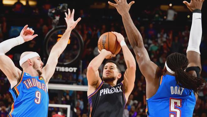 多特本赛季三分命中率33.8%,近期投篮有回暖迹象,但不够。多特作为三分之外其他进攻手段匮乏的3D,他最怕的事情不是投丢,而是对手重新意识到他是个不稳定的射手。过去2个赛季,多特常规赛三分命中率都有40%左右且产量能看。没人相信多特季后赛的时候可以保持同等准星,只是大样本产效达到每36分钟7次出手+40%准星,这个标准的三分射手一般不会被晾着。但太阳今天对多特的不尊重就比较极端了,而多一个人在篮下,自然会让雷霆的攻筐与前板变得艰难。