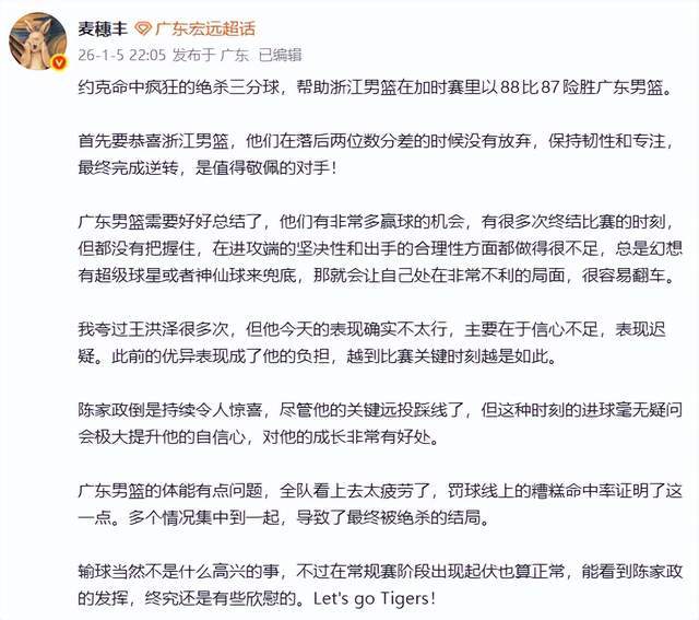 而作为广东媒体人,麦穗丰老师就不客气了,直接点出了广东男篮的问题所在,“广东男篮需要好好总结了,他们有非常多赢球的机会,有很多次终结比赛的时刻,但都没有把握住,在进攻端的坚决性和出手的合理性方面都做得很不足,总是幻想有超级球星或者神仙球来兜底,那就会让自己处在非常不利的局面,很容易翻车。”