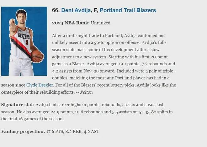 球员声望都是依靠比赛表现打出来的,在赛季初ESPN评选的NBA百大球星中,阿夫迪亚仅排名第66位,是开拓者队内三名上榜球员之一(卡马拉78,朱霍乐迪91),网站评语如下: