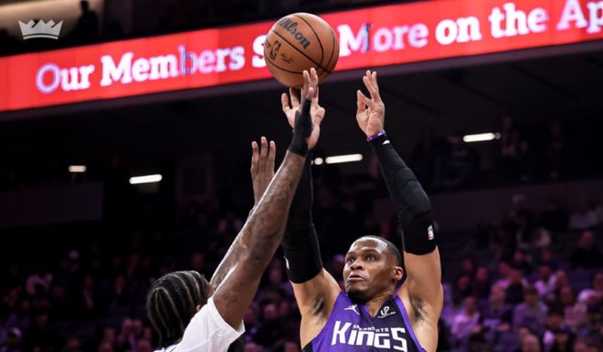 国王队这边,威少11中6得到13分4篮板7助攻3失误;德罗赞空砍2分2篮板3助攻。