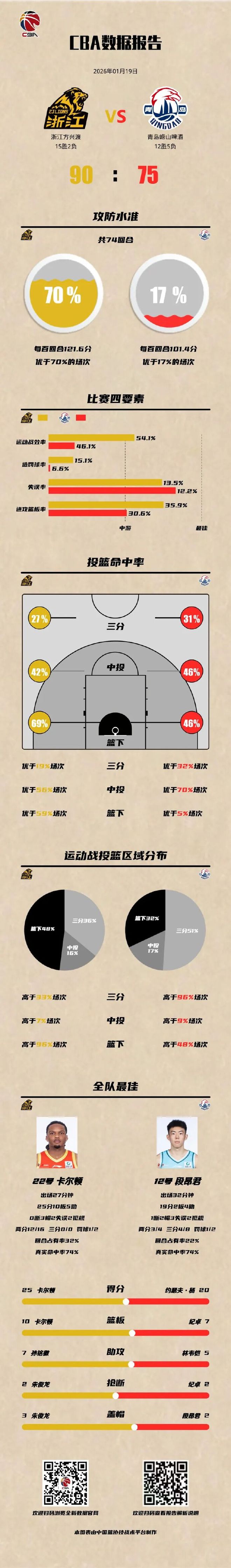 2026年1月19日,2025-2026赛季CBA联赛常规赛第17轮,青岛崂山啤酒客场对阵浙江方兴渡。本场比赛,韦瑟斯庞、米奇因伤缺席,段昂君、赵嘉义发挥出色,年轻球员敢打敢拼,全员均有进账,最终75-90负于对手,输掉比赛。