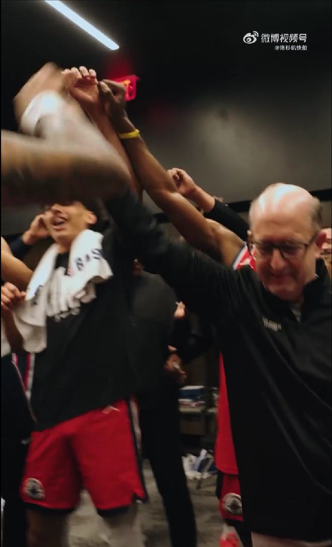 赛后,快船全队回到更衣室内庆祝6连胜,主教练泰伦-卢告诉大家,当天是助理教练杰夫-范甘迪的64岁生日。