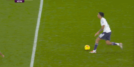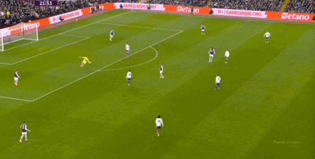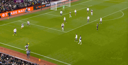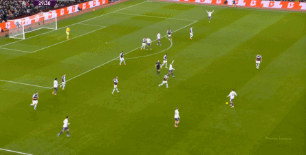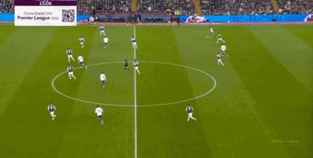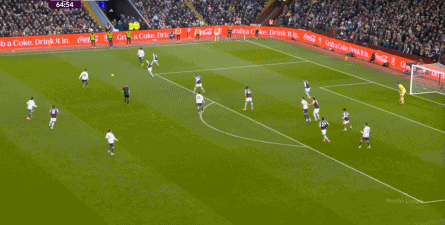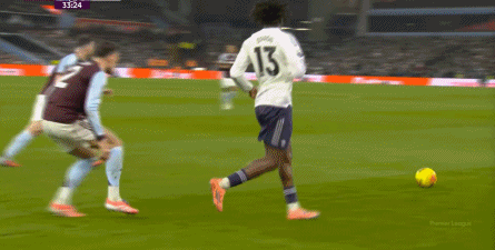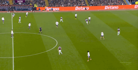 比赛第33分钟,维拉在后场轻松起脚,沃特金斯和队友在海文和乌加特的身上打出并保住优势,从而将球权转给了边路的罗杰斯,让他有了和约罗一对一的机会: