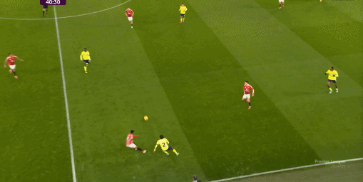而且和昨天193cm的米利防守加纳乔完全不同,给对手留出太大空间的约罗根本做不到放左防右,压不住对手使用顺足的线路,这是最大的问题: