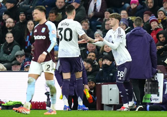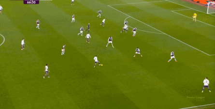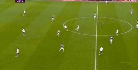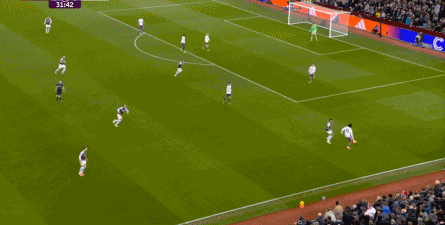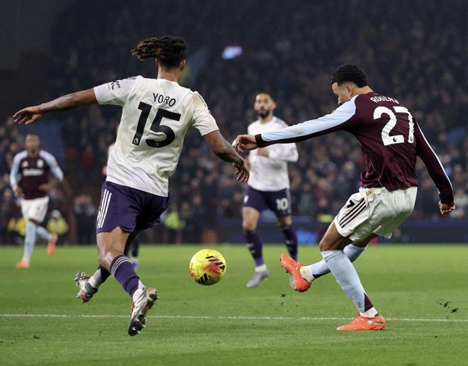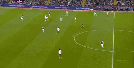 第45分钟,维拉在中场完成抢断,由来到中路的麦金顶住后卫线,联系到罗杰斯,然后在一对一中击倒了曼联: