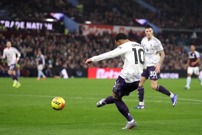 因此在比赛开局,反倒是曼联打得更为主动,在无球阶段的逼抢意愿更强,从而逼出维拉的大脚,然后借助海文的解围、芒特的衔接和维拉后卫的帮忙,让库尼亚获得了几乎是全场最舒服的一次起脚机会: