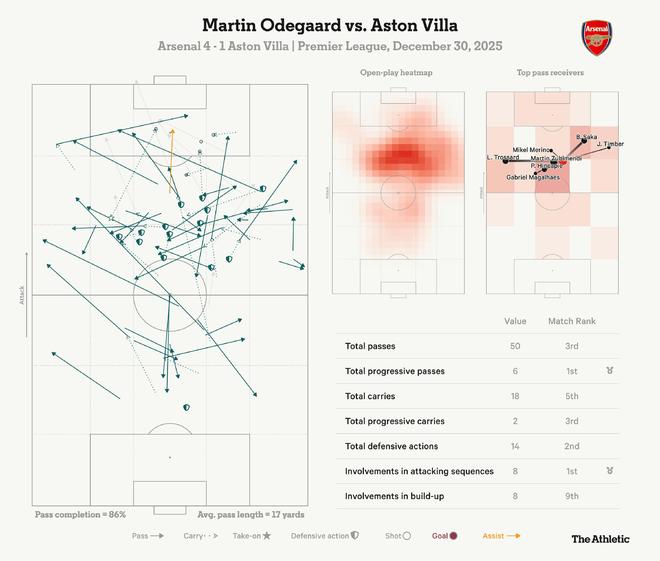 英超第19轮焦点战,阿森纳主场4-1大胜阿斯顿维拉,赛后,The Athletic发表专题文章,分析并点评了本场比赛。