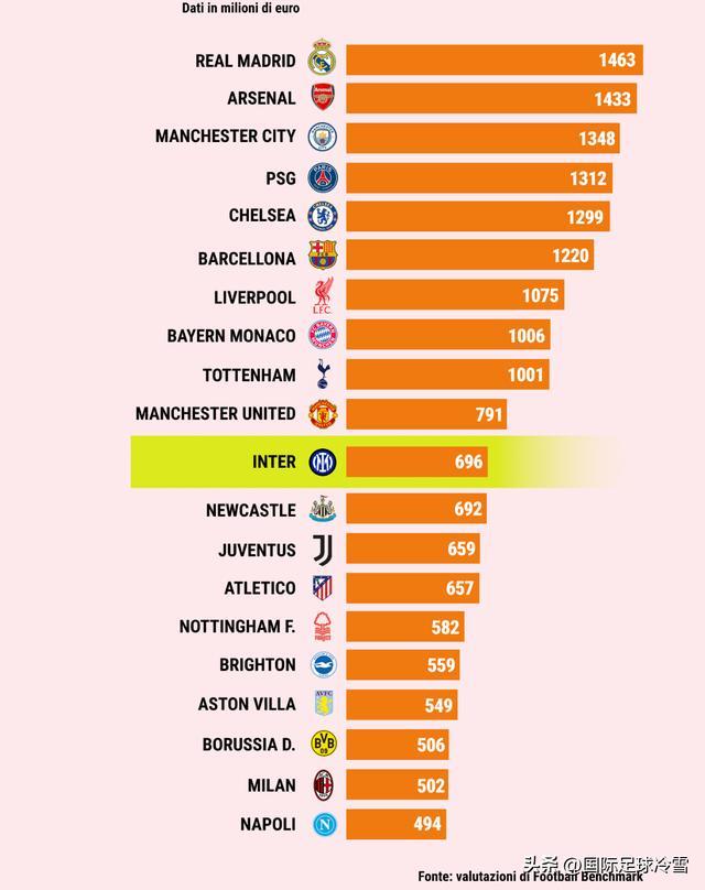 根据该机构12月的报告,国米目前的总价值是6.96亿欧元,7亿左右,是意甲第一,位列欧洲第11位。