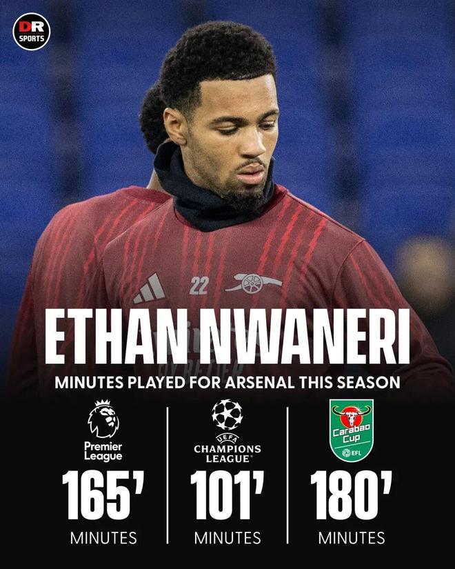 赛季至今,恩瓦内里仅为枪手出场11次,其中3次首发,打入了1粒进球。相比上赛季的37场出场,首发16次,恩瓦内里的出场场次下降明显。事实上,这位才华横溢的18岁小将尚未在英超联赛中先发出场。尽管已有6次登场,几乎全部以替补中场的身份亮相。