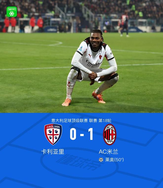 第49分钟,拉比奥右路传中,莱奥禁区后点爆射破门,米兰1-0卡利亚里