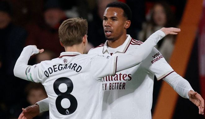 下半场易边再战。第54分钟,阿森纳反超比分!厄德高在禁区内把球回传,厄德高后插上直接推射,球进了!厄德高恰到好处的传球让赖斯能够轻松完成射门,把球打进。第66分钟,阿森纳进行换人调整,热苏斯、特罗萨德和萨卡替补上场。而伯恩茅斯则用阿德利换下布鲁克斯。