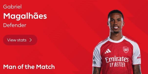 传球全场最多,加布里埃尔当选阿森纳vs利物浦全场最佳球员