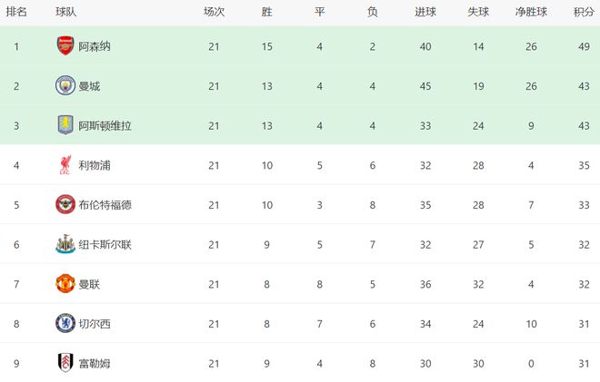 阿森纳虽然只拿到一场平局,但依然占据了榜首位置。阿森纳21轮狂揽49分排名第1,身后的曼城和阿斯顿维拉都是43分。也就是说,阿森纳有6分的优势,依然是夺冠最大热门。而利物浦则落后有点多了,只拿到35分,排名第4。事实上,利物浦第4的位置并不稳,与身后的球队差距很小。