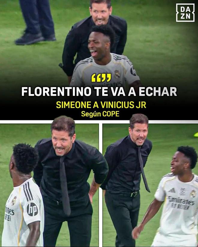 第81分钟维尼修斯被提前换下,西蒙尼做出听听嘘声的动作,维尼修斯直接向他发出“赛后见”的约战,阿隆索对西蒙尼大声警告:“待在你自己的区域。”终场哨响后,穿着外套的维尼修斯还在场边等着西蒙尼,随时准备再起争执。赛后维尼修斯还在罗马诺社媒账号的帖子下评论:“你又输了一场淘汰赛”,继续与西蒙尼的骂战。