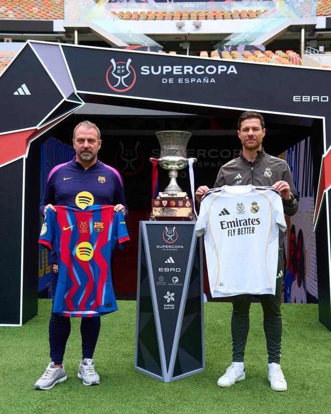 传统环节,西超杯决赛前弗里克和阿隆索在奖杯前合影