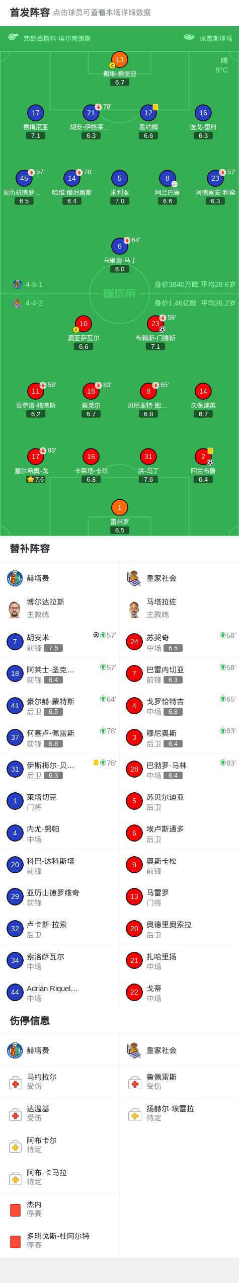 北京时间1月10日西班牙足球甲级联赛 联赛 第19轮,赫塔费主场对阵皇家社会。赫塔费胡安米破门。皇家社会布赖斯-门德斯破门,阿兰布鲁破门。最终比分赫塔费 1-2 皇家社会。