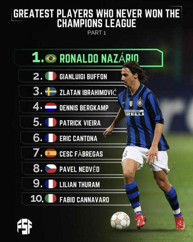 从未赢得欧冠冠军的最伟大球员榜单发布!大罗高居第一 伊布上榜