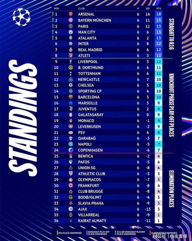 不难看出,西甲3队和英超4队,都有能力向前八名发起冲击,是最后几个名额的有力争夺者。至于目前排在第6名的国际米兰(12分),以及第10名的多特蒙德(11分),难度就很大了。